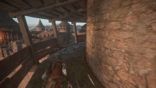 Cuando quieras avanzar, baja por la escalera de la forja, por el camino del bosque no encontrarás nada más. No tardarás en encontrar una puerta que te lleva al exterior. Enciende el poste, avanza, salta por la ventana y elimina al soldado de una pedrada en la cabeza.