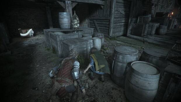 Acércate para recoger una Genciana, y ve hacia el otro lado del muelle. Hay un cofre con recursos a la izquierda, antes del saliente por el que debes trepar para continuar. Mantén a Amicia agachada y sigue a Lucas hasta llegar a una escalera por la que ambos subiréis.