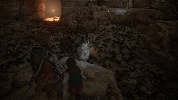 La idea es lanzar el Odoris hacia el suelo entre Amicia y Arnaud, de manera que las ratas se quiten del muro junto al soldado, para que éste se mueva hacia la izquierda, hasta la manivela. Dale la instrucción de mover la manivela para que suba una placa de madera. Dispara una flecha con Odoris y que luego tu aliado suelte el mecanismo, lo que despejará la zona. Avanza para reunirte con él, sin olvidarte de abrir un cofre coger las flechas antes de bajar por el saliente a su derecha.