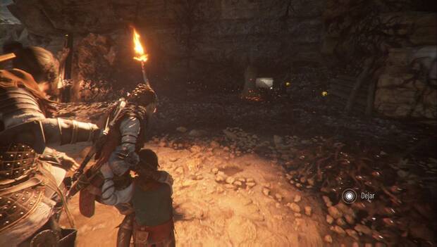 Una vez abajo, interactúa con la cuerda para mover hacia ti un carro con un brasero que, evidentemente, usaremos para cruzar. Mientras subes, ve prestanto atención al lado izquierdo, no tardarás en ver una pequeña cueva lateral.