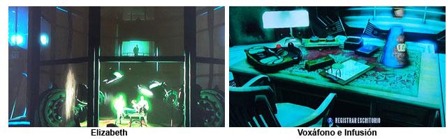 Al terminar la secuencia oímos a Elizabeth gritar, entramos a la sal de operaciones y vemos como le están haciendo algo a Elizabeth, debemos pagar las máquinas subiendo por los pasillos de los lados, en ambos tenemos torretas robóticas, al subir tenemos otras 2 torretas y hay soldados, cuando consigamos apagar uno de los interruptores vienen mas soldados y un robot patriota, una vez apaguemos el segundo interruptor Elizabeth se librará creando un desgarro, vamos a liberarla, entre las 2 entradas a los interruptores de las máquinas hay una puerta que requiere 3 ganzúas, ahora con Elizabeth la abrimos, dentro tenemos un Voxáfono y una Infusión, nos dirigimos al ascensor hacia el dirigible de Comstock.