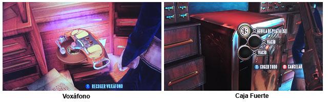 Entramos y cogemos el ascensor al que no podíamos acceder en el capítulo anterior, al llegar abajo entramos en el Salón principal del banco, nos atacan varios Vox, en las oficinas de la izquierda tenemos una caja fuerte con 1 ganzúa (contiene 187 monedas), seguimos los pasos de Lady Comstock que nos llevan hacia la cámara, pero primero vamos por la puerta de enfrente son 2 pasillos con 2 salas, en una de las salas tenemos una parte de Equipo, en la otra la clave cifrada de la misión opcional, Elizabeth dice "escribe la palabra del pueblo" Vox en la máquina de escribir, se revela un compartimento secreto dentro tenemos un Voxáfono, una Infusión, ganzúas y bastantes monedas, volvemos para seguir los pasos por la zona de la derecha, llegamos a un pasillo amplio donde nos atacan Vox y al fondo hay un francotirador, una vez les matemos avanzamos hasta el fondo y a la izquierda, veremos el desgarro al lado del ascensor averiado hay un cadáver tenemos una parte de Equipo, bajamos y activamos el 2º desgarro, no se nos olvide coger el Voxáfono al cerrarse, en el pasillo derruido de la izquierda tenemos una caja fuerte de 3 ganzúas (contiene 164 monedas) y detrás de ella otro Voxáfono, salimos al salón principal donde tendremos otra lucha contra Lady Comstock y los espíritus que levanta, al vencerlos nos dirigimos hacia Harmony Lane.
