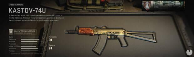 Antiguamente conocida como la AK-74u, también dentro de la era de Call of Duty 4, este subfusil, ahora convertido en fusil de asalto, ha ido teniendo diferentes nombres a lo largo de su historia, pero su efectividad ha sido siempre la misma: ser un monstruo en combate cercano. Con sus más y sus menos y siempre rivalizando con la MP5, MP7 y PP90 (Lachmann Sub, Vel 46 y MiniBack en Modern Warfare 2), la Kastov-74u es sin duda una de las opciones más recomendadas para empezar vuestro viaje por Warzone 2. Un fusil de cadencia ajustada pero de gran daño, con una grandísima movilidad y un retroceso prácticamente nulo si sabemos controlarlo.