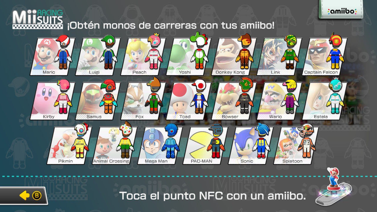 Gracias a la función NFC de Nintendo Switch, si disponemos de uno o varios Amiibo compatibles con Mario Kart 8 Deluxe podremos desbloquear monos especiales para los pilotos Mii. En total hay 20 trajes diferentes: Mario, Luigi, Peach, Yoshi, Donkey Kong, Link, Captain Falcon, Kirby, Samus, Fox, Toad, Bowser, Wario, Estela, Pikmin, Animal Crossing, Mega Man, Pac-Man, Sonic y Splatoon.