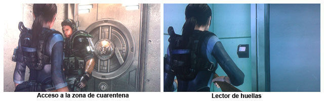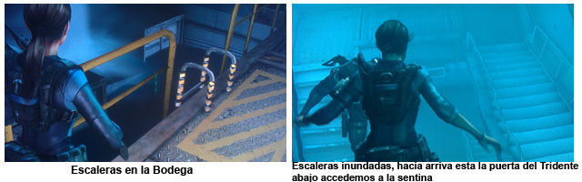 Tras la secuencia, cambiamos de pareja, Jill y Chris intentarán controlar el virus, buscando el laboratorio y Parker y Jessica retrasar el hundimiento del barco, tenemos que volver hasta la puerta con el símbolo del Tridente, nos conocemos el camino de sobra, bajamos por la sala VIP del Casino, vamos hasta el Montacargas, buceamos hasta abajo pero ahora vamos por la puerta que estaba bloqueada con la Tarjeta de Veltro (solo se puede ir por ahí) y tras un par de pasillos llegamos hasta la zona de la bodega donde nos atacó Rachael y el Scagdead, por las escaleras del fondo a la derecha cruzamos la puerta y llegábamos a las escaleras inundadas donde arriba esta la puerta con el símbolo del Tridente, la abrimos y accedemos a la zona de Cuarentena.