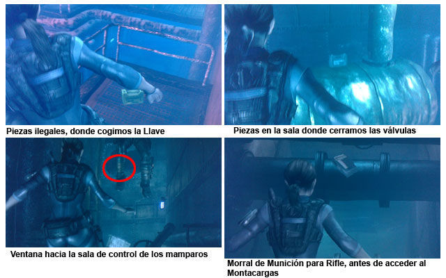 Ahora que toda esta inundado, podemos coger todas aquellas piezas que veíamos antes y no podíamos coger, avanzamos hasta donde estaba la puerta con el mecanismo y extraímos la llave para el panel de control de la sala de máquinas, enfrente de la puerta a la derecha tenemos unas piezas (cuidado que en esta zona hay 2 sea creepers) en la sala donde cojimos la metralleta AUG tenemos munición, vamos hasta la sala de máquinas y salimos por la rejilla que abrimos con la tubería, llegando al pasillo desde donde accedíamos a la sala de máquinas inferior y superior, volvemos a la sala donde recogimos el mecanismo para conseguir la llave y cerramos las vávulas, aquí tenemos otras piezas que antes no podíamos coger, vamos hacia la sala de control de los mamparos, recordemos que los bajamos y se sellaron las puertas, así que debemos acceder a ella por una ventana que esta rota, la cruzamos y nos dirigimos hacia el Montacargas, en las escaleras que nos llevaban hacia allí teníamos un Morral de munición de rifle sobre una tubería, lo cogemos y accedemos al Montacargas, sobre él tenemos unas piezas de personalización, nadamos hasta arriba y por fin se acaba el agua, Chris se pone en contacto con nosotros y nos pide que vayamos hacia el Hall, el camino lo conocemos bien, subimos hasta la sala VIP del Casino y al entrar en este sale una secuencia donde se termina la parte 1.