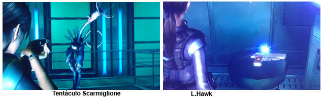 Entramos en el túnel de esterilización y nos ataca un nuevo enemigo, Scarmiglione, tiene un escudo y va cubriendo su zona inferior o superior, le disparamos a la que no cubra, cuidado con sus ataques de embestida y sus ataques punzantes (son fácilmente esquivables) cuando este desprotegido disparos a la cabeza o al pecho la zona abierta, si no le destruimos completamente luego quedarán sus piernas con un tentáculo aturdidor, la puerta se abre y podemos reunirnos con Chris para que nos eche una mano, en esta sala que abajo hay una pecera a la izquierda encontramos la Mágnum L. Hawk.