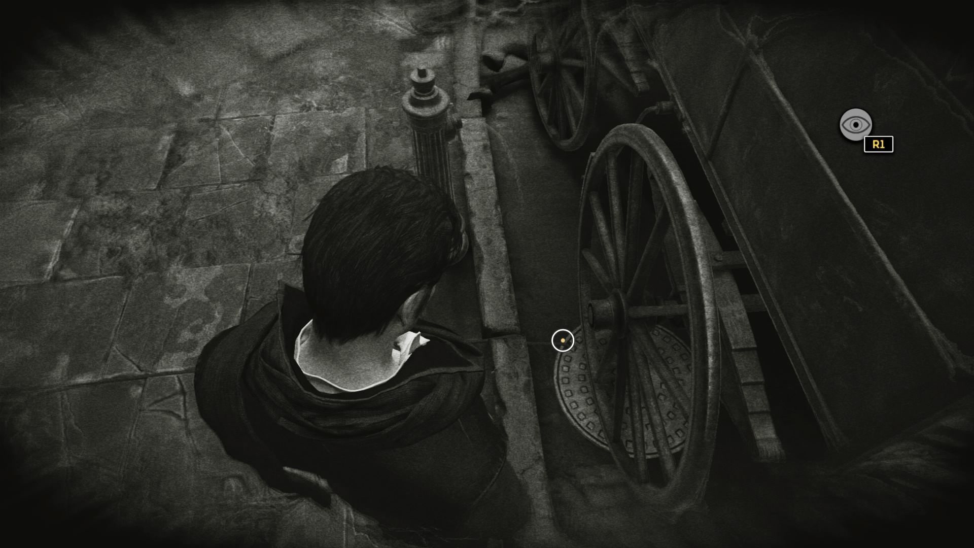 Tras confirmarlo, ve al carruaje sobre el charco. Examina las ruedas y la carrocería, donde puedes ver letras tapadas por pintura y, activando el talento de Sherlock, sacar aún más información.